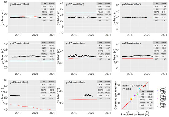 Hydrographs of groundwater levels (simulations: red line, observations: black points) with the goodness-of-fit statistics in the inset table, alongside a scatter plot of observations and simulations.