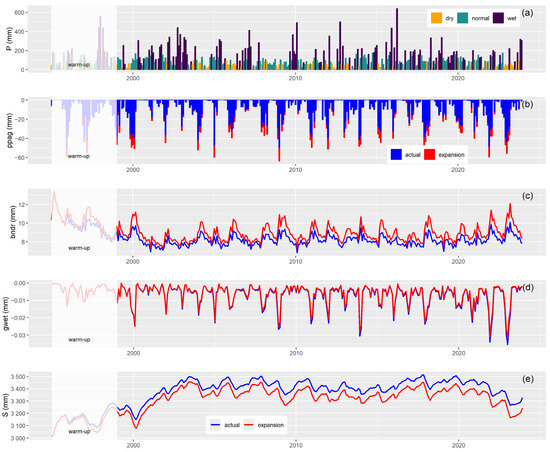 At the catchment scale, monthly precipitation, groundwater storage, and the monthly components of groundwater fluxes that exhibit significant changes are shown in Figure 5. Monthly precipitation (Figure 5a) alternates between dry, normal, and wet periods, with values ranging from near 0 to 640 mm. This wide range highlights the high precipitation variability in the region. Figure 5b illustrates that ppag increases notably during dry months, reflecting greater groundwater use for irrigation. Boundary fluxes are closely related to ppag (Figure 5d); as more water is pumped from the aquifer, the water table lowers, turning the aquifer into a sink, which in turn increases inflow across the catchment boundaries. These partial fluxes, together with other components (rech, swgw, gwsw, satx, soil, and latl, not shown in the figure), drive the changes in monthly groundwater storage (Figure 5e). Storage begins with relatively low initial values, using identical initial conditions for both the actual and irrigation expansion scenarios. After the 4-year warm-up period (1995–1998), the average groundwater storage during the 25-year period (1999–2023) is 3406 mm for the actual scenario and 3340 mm for the irrigation expansion, resulting in a mean difference of −66 mm, with a range from −105 to −31 mm.