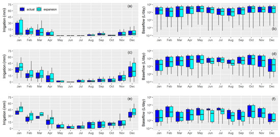 The amount of water used largely depends on moisture conditions, with dry periods requiring more supplementary irrigation. Figure 6 shows the monthly water volume used under wet (Figure 6a), normal (Figure 6c), and dry moisture conditions (Figure 6e). During wet moisture conditions, water demand is similar between the actual scenario and the irrigation expansion. Under normal moisture conditions, an increase in water demand is observed from January to April. In dry moisture conditions, water demand is significantly higher, extending from December to April (in this work, regarding boxplots, a significant difference refers to a clear change in the order of magnitude of the mean values and the width of the boxes). This variable water demand, driven by precipitation, also has a fluctuating effect on baseflow. Figure 6f shows that baseflow decreases under irrigation expansion for the location shown in Figure 7, with the effect lagging by four months after the irrigation season. However, under wet conditions (Figure 6b), no significant changes were detected, and under normal moisture conditions (Figure 6d), only a slight decrease in baseflow was observed from June to August.