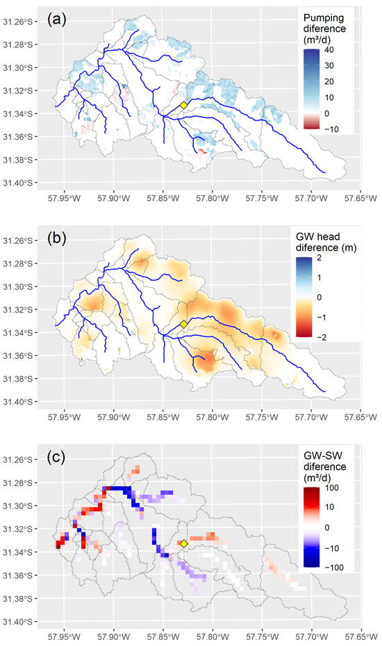 At the local scale (gwflow grid), annual groundwater depletion of up to −1.2 m is predicted (Figure 6b), with depletion zones closely matching areas of irrigation expansion (Figure 1b) and increasing mean annual pumping rates (Figure 6a). This groundwater depletion directly impacts GW-SW, with the predominant trend being a reduction in baseflows (Figure 6c). However, the spatial pattern of GW-SW indicates that baseflow could also increase in certain areas which are prone to greater contributions from the aquifer.