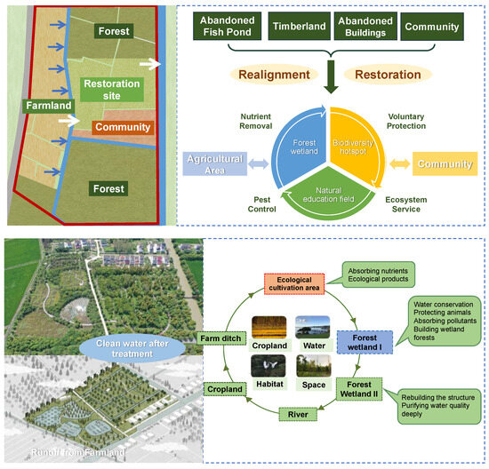 Urban sprawl and rural development in developing countries often transform rural areas from green to grey, leading to habitat loss, soil erosion, wastewater discharge, and agricultural productivity decline [1,2]. These severe changes in key environmental factors will profoundly alter the traditional lifestyle and livelihood of residents, potentially compromising their wellbeing and long-term benefits [3]. Many existing solutions rely on engineering measures to address ecosystem degradation in rural areas. However, sustaining the effectiveness of these ecological restoration projects post-implementation often presents a challenge [4]. For instance, present applications are dominated by single-function constructed wetlands that prioritize nutrient removal but neglect biodiversity and socio-economic co-benefits [5]. Accordingly, expanding objectives beyond biophysical objectives to integrate environmental and socio-economic factors could enhance ecological restoration projects’ long-term sustainability. Studies have suggested that incorporating food and other benefits into restored ecosystems would promote connections between people and ecosystems, which would improve restoration outcomes and sustain local communities [6]. Addressing these gaps requires field-scale tests that link nutrient control, biodiversity gains, and local income in metropolitan rural areas to achieve such complementary land-use goals.