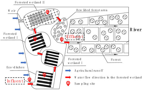 In 2022, water-quality monitoring was carried out seasonally, with additional monthly sampling during the main cropping period (June–October). Flow direction within the forested wetland and the sampling locations are shown in Figure 2. Water samples were collected at a depth of 20 cm below the surface without disturbing the sediment. The procedures for sample collection and analysis followed the standard methods [9]. Chlorophyll-a concentrations were measured using a Phyto-PAM II fluorometer (Walz, Effeltrich, Germany).