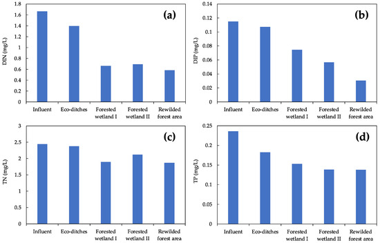 The monitoring results showed a general downstream decline in both nitrogen and phosphorus concentrations across the forested wetland in 2022 (Figure 4). For DIN, Forested Wetland I exhibited the highest removal efficiency, reducing DIN concentrations by 44%, followed by Eco-ditches, which achieved a 16% reduction. In contrast, a slight increase in DIN levels was observed after flow passed through Forested Wetland II. In terms of TN, Forested Wetland I again showed the strongest removal capacity, accounting for a 20% reduction. The Rewilded Forest Area contributed an additional 10% reduction, whereas TN concentrations increased after water flowed through Forested Wetland II. Phosphorus concentrations showed a continuous decline from the influent to the Rewilded Forest Area. For DIP, Forested Wetland I and the Rewilded Forest Area were the most effective units, reducing DIP concentrations by 28% and 23%, respectively. Forested Wetland II achieved a 16% reduction, while Eco-ditches contributed a limited 7% reduction. Regarding TP, Eco-ditches exhibited the highest removal capacity, reducing TP concentrations by 23%, followed by Forested Wetland I and Forested Wetland II, with reductions of 13% and 6%, respectively. TP concentrations remained relatively stable after passing through the Rewilded Forest Area. The combined performance of the different units highlights the importance of integrating diverse function types to enhance overall nutrient removal in constructed wetlands.