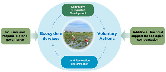 Although ecosystem services have been significantly enhanced and ecological value has been partially realized in this practice, it is worth noting that ensuring the sustainability of this process is crucial [22]. This requires the joint efforts of all stakeholders to protect the newly restored ecosystem and facilitate the realization of ecological product values (Figure 5). The government sponsored some projects to support the joint efforts of experts, volunteers, enterprises, and the local community in protecting GTI. Youth from urban areas were attracted by the beautiful scenes of Youhao Village and were willing to contribute positively to rural governance. Volunteers organized nature education courses and culture-experiencing activities to highlight the social value of GTI and promoted the sale of local green agricultural products. GTI was recorded in terms of news and documentaries to raise public awareness. Through adaptive management and the support of nature education activities, GTI has progressively emerged as a landmark that embodies the unique natural–social characteristics of the region. It serves as a “magnet”, bridging the gap between urban and rural residents and fostering the flow of external resources back into rural communities. As the importance of GTI was appreciated by both urban and rural residents, a social consensus on its conservation was formed, thereby enabling its sustainable utilization. Consequently, this enhanced the capacity to transform ecological value and achieve the sustainability of ecological protection and restoration efforts.