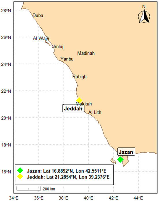 This research study was conducted in Saudi Arabia, where the data for the selected stations, Jeddah and Jazan, was acquired from the Department of Meteorology. The required data includes the rainfall on a daily basis from 1 January 1978 to 30 December 2013. Jeddah city is stationed on the western shoreline of Saudi Arabia with extremely hot desert and scorched summers, frequently suffering over 40 °C of temperature, and mild winters with 15 °C due to its coastal position. The city of Jeddah is experiencing extreme humidity levels. Jeddah is one of the flash flood-prone cities influenced by heavy rainfall incidents, mainly driven by rivers and small basins. This city hosts a major port and industrial zone and links the country to the international markets.