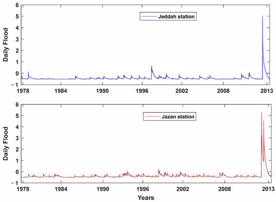 The acquired dataset includes rainfall at daily time intervals from 1 January 1978 to 30 December 2013. The specific descriptive summary including longitude (°E) = 42.551° E, 39.237° E, latitude (°S) = 16.889° N, 21.285° N, elevation = 12 and 40 m, minimum rainfall = 0, maximum rainfall = 777.7, mean = 0.27, 0.58, standard (Std.) deviation = 9.82, 13.90, skewness = 75.8, 53.3, and kurtosis = 5934.0, 2962.8 of the data for both Jeddah and Jazan stations, respectively. The maximum rainfall in both stations is approximately 777.7, whereas the skewness is positive, indicating that the right tail of the distribution is longer or heavier than the left tail, suggesting more extremely high values. The kurtosis of the rainfall data represents Leptokurtic distribution with a high value, implying heavier tails and the shape of a probability distribution by quantifying its tailedness in terms of thin or broad. The obtained rainfall datasets have a few missing values. To overcome this issue, these missing values were replaced with the average record of the previous and the next data point. The flood index [32] was computed using the daily rainfall data and based on the onset and severity of the current and antecedent day’s rainfall. Figure 2 shows the time series graph of the daily flood trends of Jeddah and Jazan stations. There were extreme flood events during 2013 in both Jeddah and Jazan stations because the FI values were greater than 2.0.