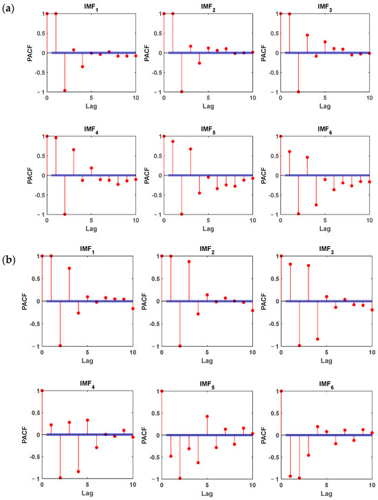 Partial auto-correlation function (PACF) of the corresponding IMFs for (a) Jeddah station and (b) Jazan station.