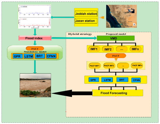 Up until now, a VMD-based hybrid decomposition model to forecast flood scenarios has never been proposed in Saudi Arabia. The novelty and contribution of this work centered around the implementation of the signal processing variational mode decomposition (VMD) method for flood forecasting. By utilizing a proper multiresolution analyzing scheme, the VMD can simultaneously extract the deep “important” forecast information from several non-stationary and nonlinear historical data. Another innovation of the current work lies in the development of Gaussian process regression (GPR) for flood forecasting. This study extends the development and application of the GPR model, which is a non-parametric probabilistic method for regression problems and offers a more flexible framework to model flood scenarios and provides uncertainty estimates. This study aims to assess the VMD method unified into forecasting models that include GPR, long short-term memory (LSTM), boosted regression tree (BRT), and cascaded forward neural network (CFNN). Incorporating VMD with GPR led to the development of the VMD-GPR model. The newly established VMD-GPR model is compared against the hybrid versions VMD-LSTM, VMD-BRT, VMD-CFNN, and standalone GPR, LSTM, BRT, and CFNN models. The proposed VMD-GPR, along with the benchmarking models, were developed using the data from Jeddah and Jazan stations in Saudi Arabia. The next section of the paper outlines the material and methods comprising the study area and data description, followed by model performance evaluation and model development. Then, the next sections present results, further discussions, and conclusions.
