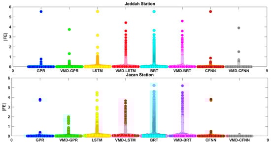 The Swarm plots in Figure 7 display the distribution of the absolute forecasted errors |FE| produced by the VMD-GPR vs. VMD-LSTM, VMD-BRT, VMD-CFNN, GPR, LSTM, BRT, and CFNN models during the daily flood forecast at both stations. Figure 7 yielded that the VMD-GPR model expresses lower |FE| errors between the observed and forecasted flood index for both Jeddah and Jazan stations as compared to VMD-LSTM, VMD-BRT, VMD-CFNN, GPR, LSTM, BRT, and CFNN models. Therefore, the Swarm plots approved the forecasting accuracy was higher for the VMD-GPR model against comparing models.