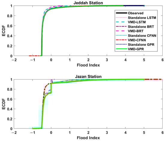 Figure 8 characterizes the empirical cumulative distribution function (ECDF) of forecasted and observed daily flood index to draw a clear illustration of the model’s efficiency. For both Jeddah and Jazan stations, the ECDF of VMD-GPR demonstrated a very close profile with the observed ECDF against hybrid version VMD-LSTM, VMD-BRT, VMD-CFNN, and standalone GPR, LSTM, BRT, and CFNN models. Overall, the ECDF in Figure 8 further confirms the accuracy of the VMD-GPR model in forecasting the daily flood index of Jeddah and Jazan stations.