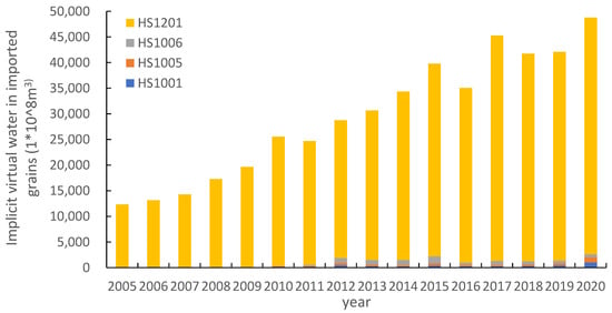 Implied virtual water for grains imports (over 16 years). Note: the data in Figure 1 are calculated based on Equations (4) and (5).