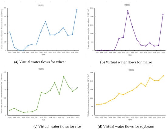 Figure 2 shows the VW resource import volume of the four grains over time. The VW resource import volumes of wheat and maize were relatively low before 2009 but rapidly increased after 2009. The VW resource volume implied in wheat and maize import trade decreased significantly after 2013 and 2012, respectively, and showed a clear upward trend starting in 2019. Before 2010, the VW resources embedded in the rice import trade were relatively small, showing an upward trend between 2010 and 2015, and remained relatively stable after 2015. The trend of changes in implicit VW resources in imported soybeans is similar to that in the total amount of implicit VW in the grain import trade, showing a steady upward trend, increasing by more than twice compared to 2005. Among them, the amount of imported VW resources in the maize trade has grown the fastest. In 2020, the number of hidden VW resources in imported maize was 1214 times that in 2005, with an astonishing growth rate. The growth rate of wheat was the slowest, but it maintained an average annual growth rate of 5.48%. The average annual growth rates of rice and soybeans were 11.99% and 9.25%, respectively.