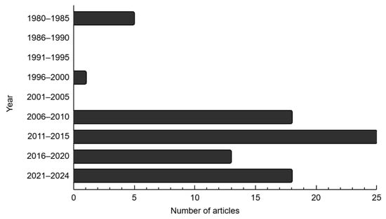 The number of articles published is shown in Figure 2, from 1980 to 2024, with a five-year interval. The year interval shows that the number of articles published was highest in 2011–2015, followed by 2006–2010 and 2021–2024. These intervals are interconnected due to a massive oil spill incident in Guimaras on 11 August 2006 [34]. The incident heavily impacted the coastlines of several nearby and adjacent islands. As a result, the published articles for these year intervals were abundant. Nevertheless, there were no articles published in the year the spill occurred, and it took two years before the first articles on the Guimaras oil spill were published. On the other hand, studies from 2016 to 2024 mainly reported the analysis of marine bacterial community structure using next-generation sequencing [21] and material characterization of natural zeolites for oil pollution remediation [35].