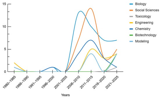 In biology, the number of articles increased significantly between 2006 and 2010, followed by a decline in the following periods: 2011 to 2014, 2016 to 2020, and 2021 to 2025 (Figure 3). However, biology has the highest number of articles among all fields throughout the timeline. The remarkable number of articles in this field can be attributed to the occurrence of the massive Guimaras oil spill that happened in 2006 [34] and other more minor oil spills in the Philippines [12]. Researchers have also explored the ecological impacts of oil spills on various organisms such as shrimp [59], fungi [43], fish, corals, plankton [42], bacteria [41], and phytoplankton [60], as well as the effects of polycyclic aromatic hydrocarbons (PAHs) on aquatic life [55].