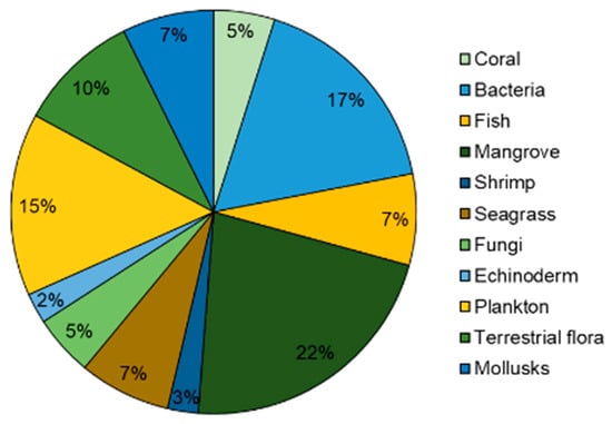 Figure 4 shows the different types of organisms studied in the biology articles included in the present review. Of the 40 species studied, mangroves were the most widely studied, with nine articles (22.0%). This is followed by bacteria (17.1%), which are often used in studies due to their biodegradation potential, and plankton (14.6%). Terrestrial flora accounted for 9.8%, while fish, seagrass, and mollusks each represented 7.3%, mainly due to their importance in food security and the economy. The least studied organisms are echinoderms, coral, fungi, and crustaceans (shrimps), ranging from 2.9% to 4.9%, with fewer than three studies for each group.
