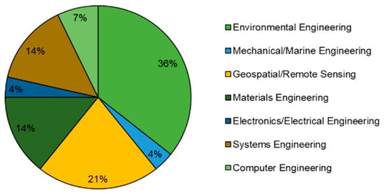 Engineering is critical in advancing oil spill research, particularly in developing response systems, detection technologies, modeling tools, and remediation materials. Figure 5 shows the distribution of various engineering sub-disciplines investigated in the engineering studies included in the review. Environmental engineering emerged as the most dominant field (36%), consistent with the ecological nature of oil spill mitigation, focusing on sorbent materials, clean-up systems, and spill response modeling [71]. This is followed by Geospatial and Remote Sensing (21%), which involves using SAR and optical satellite images, GIS-based oil extent mapping, and image classification techniques for monitoring and detection [72]. Other relevant disciplines include materials engineering (14%), commonly seen in studies that developed natural or modified oil sorbents like kapok fiber [58], zeolite [35], and activated carbon [73]. Systems engineering (14%) was represented by studies applying system dynamics modeling, hydrodynamic simulation using EFDC, and an oil trajectory forecasting tool like GNOME [74]. Computer engineering (7%) appeared in studies incorporating machine learning approaches to improve the accuracy of oil detection from satellite imagery [75]. Lastly, a smaller portion of the studies involved electronics/electrical engineering (4%) and mechanical/marine engineering (4%), which covered sensor-integrated buoy systems and the physical design and deployment of ocean monitoring equipment, respectively [64]. This distribution underscores the interdisciplinary nature of oil spill engineering research in the Philippines, while indicating fields that are less represented that could improve future research through more integrated and holistic approaches.