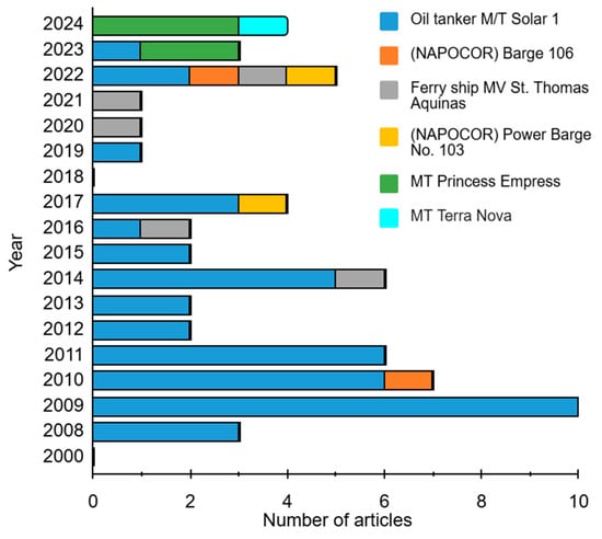 The primary source of oil spills reported in the Philippines was predominantly from vessels [12]. The M/T Solar 1 oil tanker from the 2006 Guimaras oil spill was the most frequently mentioned marine vessel in published studies from 2008 to 2024 (Figure 7). The M/T Solar 1 oil spill, which happened in 2006, received significant attention as it has been described as one of the worst in Philippine history [79]. The spill caused significant damage to the environment, harming marine life, coastal communities, and local economies [80]. It has since become a significant case study to understand the impact of oil spills in the Philippines.