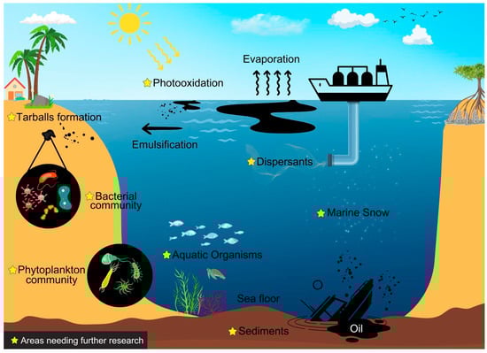 However, studies on the fate of oil (as illustrated in Figure 8) after exposure to sunlight under Philippine conditions remain limited in the realm of the published literature on oil spill research. Specifically, the study of oil metabolites and their degradation in different environmental compartments, such as mangrove sediments, beaches, coastal waters, and seagrass beds, is notably lacking. There is a gap in our understanding of which hydrocarbons are effectively degraded in these diverse environments. Furthermore, Sombito et al. (2009) [41] confirmed the presence of petroleum hydrocarbon-degrading bacteria in some affected areas in Guimaras. However, the analysis of bacteria existing in tarballs, a common consequence of oil spills in the environment [105], is also an area that has not received adequate attention and further study. In addition, the examination of residual hydrocarbons within tarballs remains unexplored. This study direction can be undertaken in the Philippine environment due to the country’s tropical climate. Currently, there are no studies on the role of dispersants on the fate of marine oil and its interaction with organisms including phytoplankton, zooplankton, microorganisms, and other macroorganisms. The effect of intense solar radiation on the fate of the oil and the impacts on the environment are relatively unknown under ambient conditions. Filling these gaps would significantly contribute to a comprehensive understanding of the ecological impacts and recovery processes following oil spills in the Philippine context.