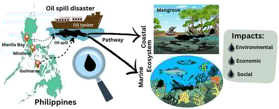 Overall, the current research on oil spills in the Philippines reveals apparent gaps that need urgent attention. While researchers have tried to understand and reduce the impacts of oil spills, many key areas remain underexplored. This review highlights the need for more in-depth studies, particularly on the 2023 Mindoro Oil Spill and the 2024 Manila Bay Oil Spill, as well as on minor oil spills, to better understand the fate of spilled oil and its long-term effects, so that researchers can develop better ways to manage future spills. The environmental behavior of oil and its impacts on the natural ecosystem, the economy, and society need to be systematically studied (Figure 9). By addressing these gaps and fostering interdisciplinary collaboration, future research can enhance oil spill preparedness, improve the response strategies, and strengthen community resilience across the Philippines, an archipelago with one of the longest coastlines in the world.