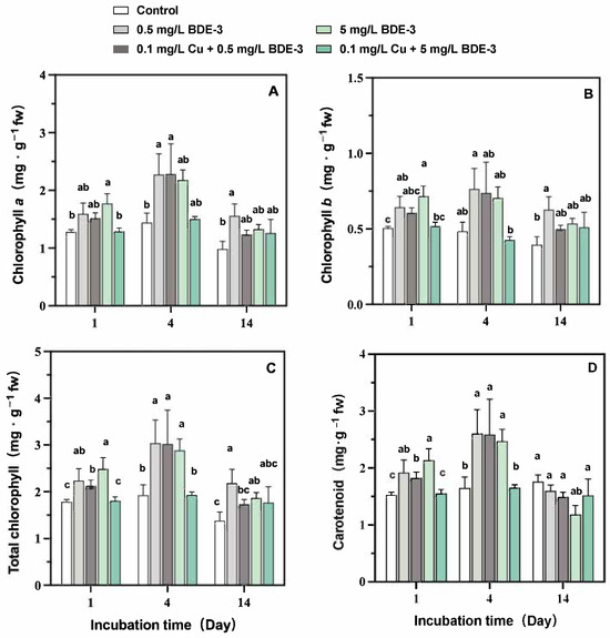 Effects of BDE3 and together with Cu on chlorophyll a (A), chlorophyll b (B), carotenoid (C), and total chlorophyll (D) of S. natans. Different small letters represent statistically significant differences among treatments (p < 0.05, Duncan test).