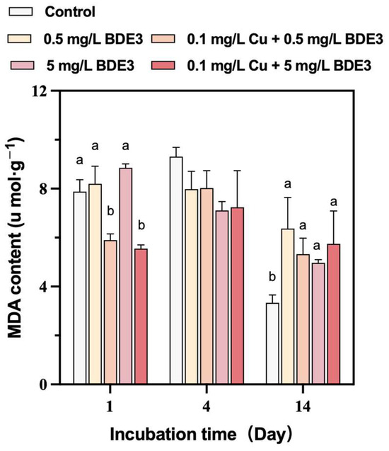 Effects of BDE3 and together with Cu on MDA in S. natans. Different small letters represent statistically significant differences among treatments (p < 0.05, Duncan test).