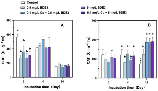 With exposure to environmental pollutants, ROS, including free radicals and H2O2 produced in plants, could cause oxidative damage to the membrane system, such as macromolecule damage and lipids peroxidizing [31]. Antioxidant defense systems play a crucial role in eliminating prooxidants and scavenging free radicals during the long-term evolution of plants [32]. Antioxidant enzymes, including SOD and CAT, are able to combat ROS accumulation and, therefore, can be used as indicators of oxidative stress for plants [33]. After one day of incubation, there was no significant effect on the SOD activity of S. natans under individual BDE3 stress in higher or low doses and combined stress with Cu (Figure 3). On day one, a significant decline was observed in SOD activity after exposure to BDE3 in both concentrations as well as combined exposure of BDE3 (5 mg L−1) and Cu compared with control (p < 0.05). However, SOD activity was not significantly different under exposure of BDE3 and combined with Cu from control on day 4 and day 14 (Figure 3A).