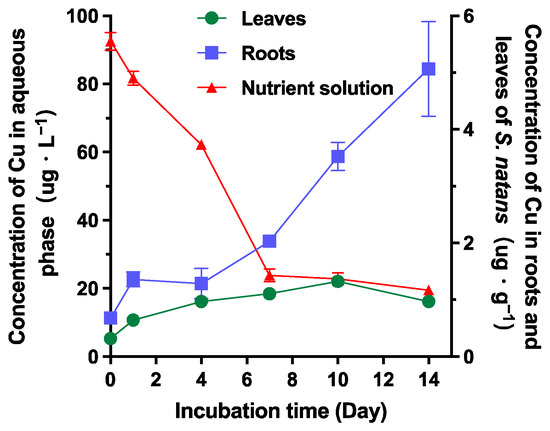 Concentration of Cu in different phases: nutrient solution (left y axis), in roots and leaves of S. natans (right y axis) during 14 days incubation (n = 3).