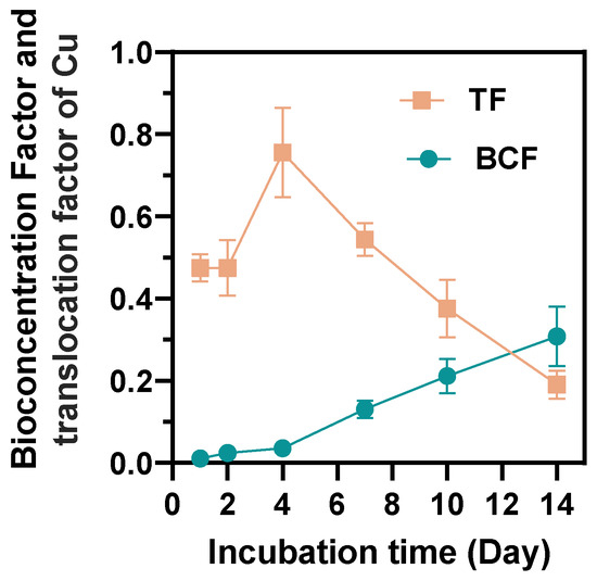 Bioaccumulation factor and translocation factor of Cu during 14 days incubation (n = 3).