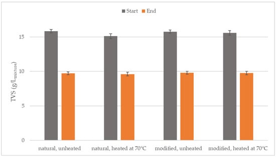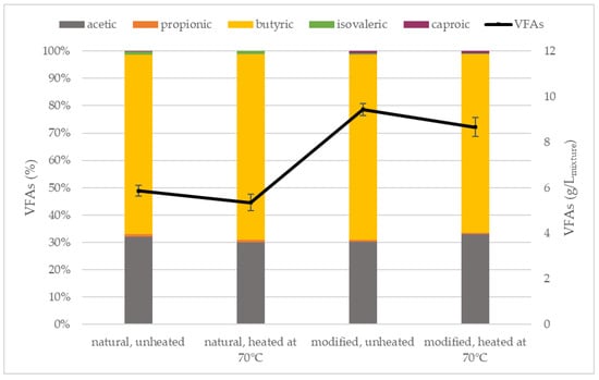 Figure 5 shows the quantity and composition of the produced VFAs. The highest production of VFAs occurred in the variant with modified, unheated starch (9.43 g/Lmixture), followed by modified, heated starch. In the variants with natural starch, the production of VFAs was noticeably lower by as much as 38% in the case of unheated variants. This suggests that the use of modified starch promoted VFA production. Heating worsened the production, but the modified sample still produced more VFAs than the natural starch samples.