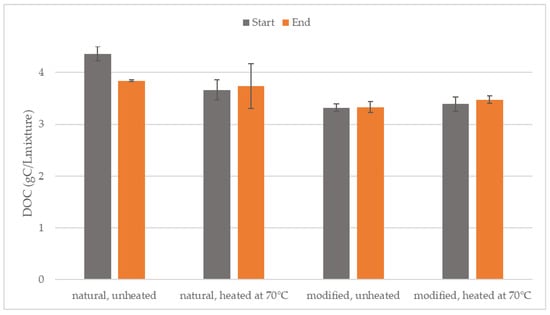In DF, microorganisms break down complex organic substances (TV, TVS) into simpler compounds, leading to a decrease in their content []. In Figure 2, changes in TVS are observed, while Figure 3 shows changes in DOC during the DF process. The largest decrease in TVS was observed in the sample with natural, unheated starch, which may indicate more intensive substrate utilization by fermentative microorganisms. The decrease in DOC in this sample also confirms greater substrate utilization. On the other hand, DOC for the other variants did not show a clear downward trend and remained at a similar level. This may suggest transformations of organic compounds that, instead of being degraded, transitioned into more stable forms. The decrease in TVS indicates that the organic material was effectively converted into fermentation products, but the lack of changes in DOC suggests that the hydrolyzed organic matter from the solid phase was primarily converted into carbon dioxide, rather than being further transformed into other forms of organic carbon []. During dark fermentation, complex organic compounds (such as proteins, lipids, and non-starch polysaccharides) undergo anaerobic digestion. Some of the organic matter is converted into gases (e.g., hydrogen and methane), while the remaining portion may form more resistant, stable organic compounds, such as humic substances or high molecular weight compounds. These compounds can be difficult to degrade and are not easily detected by standard DOC assays, which typically measure low molecular weight and soluble organic carbon. Therefore, even though TVS (which reflects total organic matter) may decrease, DOC levels may remain stable or change only slightly, as soluble carbon is transformed into forms that are not detectable by standard DOC tests [,,].