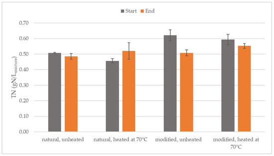 Organic and ammonium nitrogen can influence the activity of fermentative bacteria. In the conducted experiments, total nitrogen (TN) remains relatively stable, as shown in Figure 4, suggesting that the degradation processes of proteins and amino acids were not the dominant mechanism, and no excessive accumulation of ammonia occurred, which, at high concentrations, can be toxic to fermentative bacteria. The variants with modified starch initially had a higher TN level than the samples with natural starch, which may result from the introduction of additional nitrogen components during the modification []. The largest decrease was recorded for the variant with modified, unheated starch, which suggests intensive nitrogen utilization by microorganisms in metabolic processes. The increase in TN in the sample with natural, heated starch may result from the release of nitrogen from decomposing organic compounds or from reduced microbial activity [].