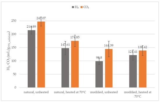 DF using modified starch as a substrate generates lower amounts of H2 compared to variants based on natural starch. However, heating the samples with modified starch positively influenced H2 production, which was higher than in unheated samples. This may indicate the activation of more efficient metabolic pathways due to the high temperature. Thermal activation of enzymes, such as amylases, increases the rate of starch hydrolysis, which enhances the availability of easily fermentable sugars like glucose and maltose. This, in turn, intensifies bacterial metabolism and promotes hydrogen production. On the other hand, changes in the microbial community structure, such as the thermal selection of microorganisms tolerant to higher temperatures (e.g., certain Clostridium species), can shift the dominant metabolic pathway, potentially favoring hydrogen production over chain elongation. In the short term, enzymatic activation is typically the dominant factor, while with prolonged exposure to heat, changes in the microbiome may have a greater impact on the process [,,,]. The highest amount of H2 was obtained from unheated natural starch, suggesting that under these conditions, the traditional butyric–acetic fermentation mechanism dominated. Studies indicate that starch modification, especially through processes like enzymatic modification, can alter its structural availability, thus affecting the efficiency of fermentation, including H2 production. Results, which show lower H2 production from modified starch, are consistent with the theory that starch modification can introduce structural changes that limit the availability of substances for complete fermentation, leading to lower H2 production [,,].