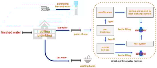 Direct-drinking water originated from the conception of dedicated drinking water systems (DDW) with tertiary treatment of water in which tap water, as source water, is processed by deep purification treatments (i.e., membrane filtration) [,]. Tap water, also called drinking water in standards, is considered to be potable, but it is possible that certain contaminants could be introduced by long-distance water delivery and water storage from the water system to the tap [,,]. Direct-drinking water facilities are defined as bottle filling stations with advanced water treatment, which have gained general popularity in China due to cost considerations (Figure 1) []. Unfortunately, these facilities still have a risk of water contamination due to maloperation. The 2005–2017 direct-drinking water sanitation analysis reported that 80.02% of direct-drinking water met standards for drinking water quality (GB 5749) on average, lower than 85.15% in contemporaneous tap water, and the main factor in health risk was microbial contaminant []. Thus far, on the other hand, no national water quality standard for direct-drinking water has been implemented in China.