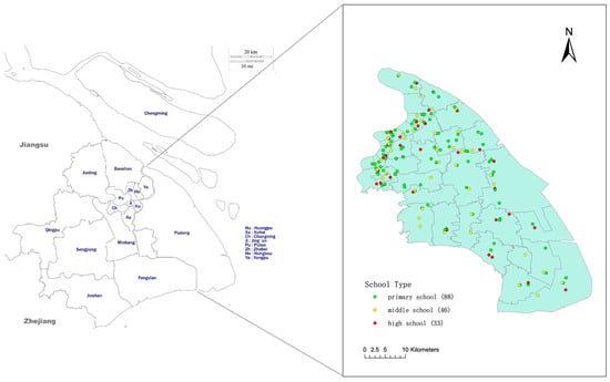 We conducted a cross-sectional study in public schools across all 47 sub-districts in Pudong New Area, Shanghai between September and October 2024. The sub-districts were determined by community health service areas in this study. In total, 188 schools were invited to participate, with two primary, one middle, and one high school randomly chosen from each sub-district. Of these, 167 schools (89%) agreed to participate and finally formed the sample in the present analysis. The distribution of the participating schools on the map is shown in Figure 2. In this study, school drinking water contained tap water and direct-drinking water, and they shared the same standards for drinking water quality (GB 5749) []. Generally speaking, school direct-drinking water was defined as drinking water supplied from bottle-filling stations with point-of-use advanced water treatment or barreled pure water dispensers in school. Tap water in schools may meet drinking requirements but is actually used for washing hands. Each participating school was visited by trained research staff on one day to complete a direct observation of direct-drinking water availability at the school.