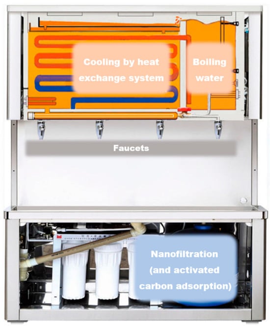Distributions of key components regarding direct-drinking water access among primary, middle, and high schools in central and surrounding areas are shown in Table 1. Only nine brands were involved in this study, due to government procurement in school direct-drinking water facilities generally. There were three main types of direct-drinking water facilities in schools, including water facilities with reverse osmosis and heat function, water facilities with a combination of nanofiltration and a hot water system (Figure 3), and barreled water dispensers with a heating function. The water facilities with nanofiltration and a hot water system were the most popular direct-drinking water facilities among primary, middle, and high schools.