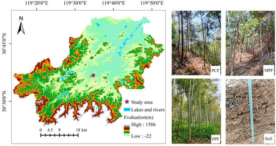 The study was conducted in the Soil and Water Conservation Demonstration Park (30°36′ N, 119°35′ E) located in Anji County, Huzhou City, Zhejiang Province, China (Figure 1). This region experiences a typical subtropical maritime monsoon climate characterized by four distinct seasons, with approximately 70% of the annual precipitation (1400 mm) concentrated between May and August. The mean annual temperature is 16.6 °C. The area is recognized as the “Bamboo Town of China” and the birthplace of the ecological development concept “lucid waters and lush mountains are invaluable assets”. The basic soil characteristics of the study area are summarized in Table 1. The soils are classified as Yellow-Brown Earth (Hapludalfs according to USDA Taxonomy), corresponding to Acrisols in the FAO classification system, with a solum thickness ranging from 40 to 60 cm. The understory is densely covered with shrubs and herbs, dominated by three vegetation types: pure Cunninghamia lanceolata forest, pure Phyllostachys edulis forest, and mixed Cunninghamia lanceolata-Phyllostachys edulis forest.