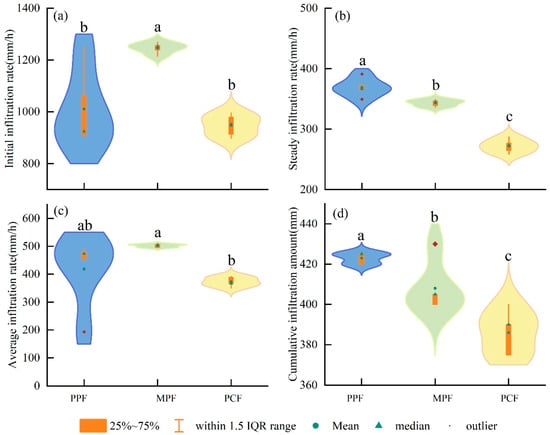 For the stable infiltration rate (SIR), mean values varied between 272.0 and 369.0 mm·h−1, following the order PPF > MPF > PCF (Figure 2b). The average infiltration rate (AIR) exhibited a range of 373.1–498.2 mm·h−1, where both PPF and MPF demonstrated significantly higher rates than PCF (p < 0.05; Figure 2c). Cumulative infiltration amounts (CIAs) differed significantly among stands (p < 0.05), with means of 386–423 mm ranked as PPF > MPF > PCF (Figure 2d).