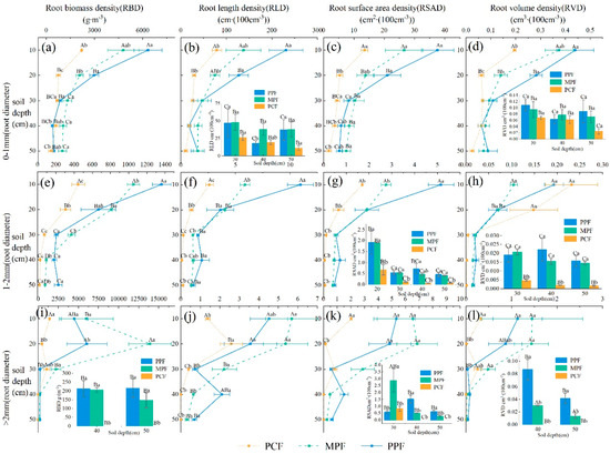 Differentiation of root traits by diameter class among three forest types in 0–50 cm soil layers. Different uppercase letters indicate vertical significant differences among the different soil depth within the same forest stand type at a significance level of p < 0.05 (Duncan’s multiple comparison test). Different lowercase letters indicate significant differences among the forest types within the same soil depth at a significant level of p < 0.05.