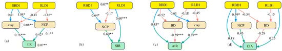 Effects of soil physicochemical properties and root characteristics on IIR (a), SIR (b), AIR (c), CIA (d). * means significant effects (p < 0.05), ** means extremely significant effects (p < 0.01), *** means extremely significant effects (p < 0.001).