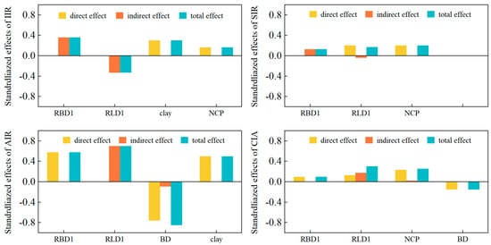 For the IIR, soil clay content and NCP exerted significant positive effects, with standardized path coefficients of 0.76 and 0.42, respectively. RBD and RLD showed no direct effects, yielding total effects of 0.362 and −0.327, respectively (Figure 5). Regarding the SIR, only soil NCP had a significant positive impact (standardized coefficient = 0.60). RBD again had no direct effect, whereas RLD exhibited a direct effect of 0.60; the total effects of RBD and RLD on the SIR were 0.13 and 0.168, respectively (Figure 5). For the AIR, BD negatively influenced infiltration (standardized coefficient = −0.59), while clay content was positively related (standardized coefficient = 0.39). RBD showed a direct positive effect of 0.45, and RLD had no direct effect; the resulting total effects were 0.577 for RBD and 0.698 for clay content (Figure 5). Finally, for the CIA, soil BD again had a negative effect (−0.29) and NCP a positive effect (0.45). Both RBD and RLD contributed direct effects of 0.18 and 0.25, respectively (Figure 5).