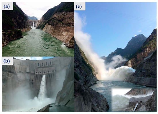 Atomized rain fields induced by different flood discharge atomized sources at the Jinping-1 hydropower station. (a,b) Atomized source of a dam orifice discharge. (c) Atomized source of a spillway tunnel discharge [13].