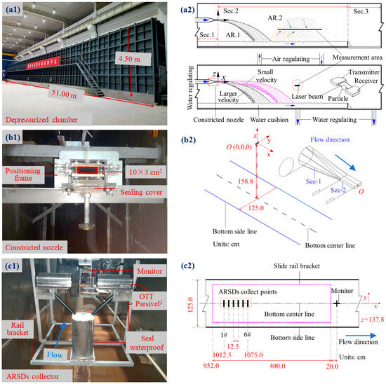 A novel test control system chartered by high-speed waterjets and low ambient pressures was used to carry out the depressurized random splash experiments at the State Key Laboratory of Hydraulic Engineering Simulation and Safety (current name: State Key Laboratory of Hydraulic Engineering Intelligent Construction and Operation) of Tianjin University. The hydraulic depressurized chamber is intended for hydrodynamic simulations of high-altitude hydropower stations, not for traditional cavitation studies, so the vacuum degree is designed with reference to the absolute air pressure in the high-altitude area. The raindrop size distribution measurement methods are generally based on the principles of laser signals and image identification. It is reasonable to adopt various chemical test papers combined with postprocessing of graphics in the instantaneous atomized raindrop size distribution collection of random splash experiments under atmospheric pressure. However, this method is not suitable for the measurement of depressurized random splash experiments because measurement times are difficult to control, measurement conditions are difficult to switch, and instantaneous atomized raindrop size databases are not conducive to the statistical analysis of time–history characteristics. Therefore, an OTT Parsivel2 with a 54 mm2 rectangular area is introduced to collect the atomized raindrop size in real time, which can be moved horizontally along the flow direction via a remotely controlled horizontal slide rail. The experimental area is in the depressurized chamber that is connected with water-regulating and air-regulating systems, in which the atomized rain is splashed by a high-speed rectangular waterjet from a constricted nozzle that impacts a rectangular water cushion with an initial depth of 56 cm. The experimental coupling conditions between water flow and ambient pressure are adjusted with reasonable shunt designs and effective monitoring devices. In detail, the layout of the depressurized chamber is shown in Figure 2a,b, the layout of the measurement instrument and points is shown in Figure 2c, the air-regulating system is shown in Figure 3a, and the water-regulating system is shown in Figure 3b.