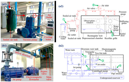 Physical and schematic diagram of the water- and air-regulating systems in the depressurized random splash experiments. (a1) Physical picture of air-regulating system layout; (a2) Schematic diagram of air-regulating system layout; (b1) Physical picture of water-regulating system layout; (b2) Schematic diagram of water-regulating system layout.