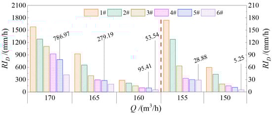 The initial step in data analysis involves calculating the atomized rainfall intensity RID (mm/h) (Formulas (1 and 2), see [43,44]) at the measurement point under normal ambient pressure. This corresponds to the actual atmospheric pressure within the laboratory setting (P1 = 1.02P0)) for further analysis. As illustrated in Figure 4, the atomized rain intensity directed downstream toward test surfaces 1# to 6# under various inflow conditions, with an ambient pressure of P1 (1.02P0), demonstrates that the atomized rain intensity increases as the inflow rate of the waterjet on the same test surface rises. Conversely, when the inflow rate of the waterjet remains constant, it exhibits a decreasing trend along the flow direction, which aligns with existing research findings [9]. Boundary values of 2, 10, 40, 200, and 600 mm/h have been selected for characteristic lines of rainfall intensity in accordance with industry standards outlined in the design specifications for concrete arch dams (SL282-2018) and spillways (SL253-2018). As illustrated in Figure 4, test surface #6 (flow direction coordinate of 10.750 m) under working condition D(1–3)1 and test surface #5 (flow direction coordinate of 10.625 m) under working condition D(3–5)1 belong to the above different protected zones. Therefore, these conditions can be considered baseline conditions for analysis. It can collaboratively reflect the impact of the inflow discharge from the waterjet and the measurement location on the test surface.