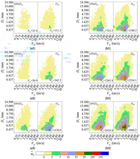 Two-dimensional atomized raindrop spectrum of typical atomizing rain intensity conditions under different ambient pressures (P(D(1–3)1 and D(3–5)1) = 1.02 P0, P(D(1–3)5 and D(3–5)5) = 0.66 P0; the flow direction coordinate of the test surface #5 and 6 is 10.625 m and 10.750 m, respectively). (a1) RID(D11) = 5.25 mm/h, Q(D1p) = 150 m3/h; (a2) RID(D21) = 28.88 mm/h, Q(D2p) = 155 m3/h; (a3) RID(D31) = 53.54 mm/h, Q(D3p) = 160 m3/h; (b1) RID(D31) = 95.41 mm/h, Q(D3p) = 160 m3/h; (b2) RID(D41) = 279.19 mm/h, Q(D4p) = 165 m3/h; (b3) RID(D51) = 786.97 mm/h, Q(D5p) = 170 m3/h.