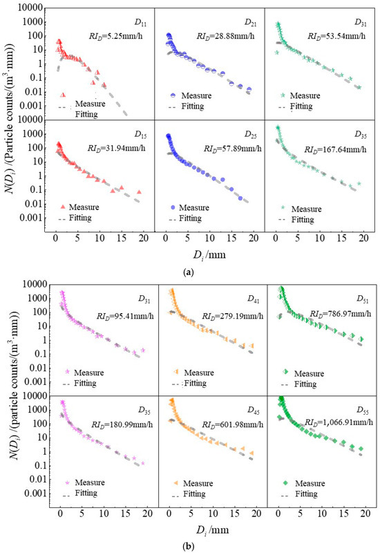 Here, is the per-unit sampling period, 60 s; is the precipitation measured during this sampling interval, mm; is the graded particle number, which refers to the quantity of particles per unit sampling period corresponding to a specific subchannel within a 30 × 32 coordinate matrix without two small particle size channels (Table A1); and is the effective sampling area estimated related to graded diameter sizes (Di, mm), a flow length (W, m) of 0.03 m, and a transverse width (L, m) of 0.18 m (Equation (1)).
