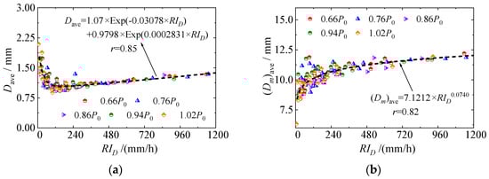 Statistical Characteristics of the Atomized Raindrop Spectrum. (a) Correlation analysis of RID–Dave; (b) (Dm)ave–RID under a series of test conditions.