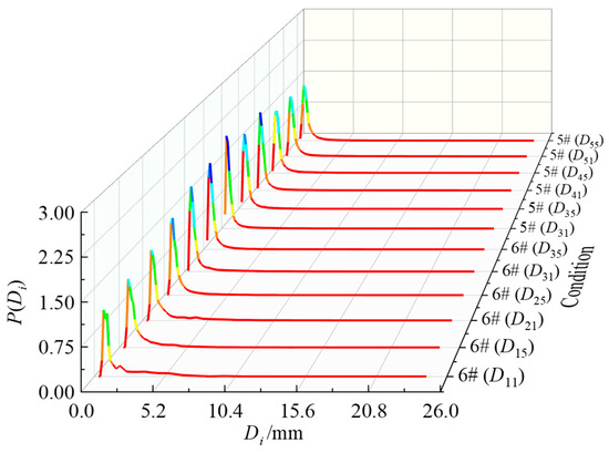 The probability density of the number concentration corresponding to the median value of each group of atomized raindrops with varying diameters is illustrated in Figure 9. Its predominant spectral type is unimodal, and its skewness trend increases rapidly and then decreases gradually as the particle size of the atomized raindrops increases, ultimately resulting in a left-skewed distribution. The positions of the main peaks are predominantly concentrated within the small particle size range, specifically for particles less than 1 mm in diameter. Furthermore, the impact of variations in the testing conditions on the probability density of the number concentration of spray droplets appears to be minimal, with a range between 1.13 and 1.93.