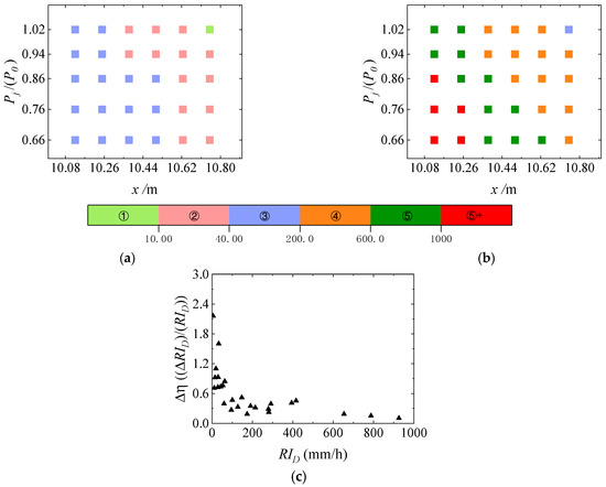 In this work, the atomized rain calculation is based on the raindrop spectrum at specific measurement points. The enhancement characteristics of rain intensity at various atomization planes under low pressure are illustrated in Figure 10a,b. The color code represents the atomized rain areas corresponding to specific rainfall intensity thresholds of 10 mm/h, 40 mm/h, 200 mm/h, and 600 mm/h. These categories are designated class ①, class ②, class ③, class ④, and class ⑤, respectively. Additionally, rainfall intensities of 1000 mm/h and above are classified as class ⑤+. Based on the test conditions of normal ambient pressure (P1 = 1.02P0), the average growth rate Δη of the rain intensity ΔRID on the spray surface of the discharge flow was calculated when the ambient pressure was decreased by 0.1P0, as depicted in Figure 10c.