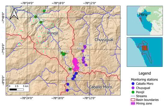 The following supporting information can be downloaded at https://www.mdpi.com/article/10.3390/w17121724/s1. Table S1: Monitoring Stations in the Caballo Moro zone; Table S2: Monitoring Stations in the Perejil zone; Table S3: Monitoring Stations in the Chuyugual zone; Table S4: Concentration of hydrogen ions (pH) and sulfates at some monitoring stations in the Caballo Moro, Chuyugual, and Perejil zones; Table S5: Concentration of manganese (mg/L), arsenic (mg/L), and mercury (mg/L) at some monitoring stations in the Perejil and Chuyugual zones.